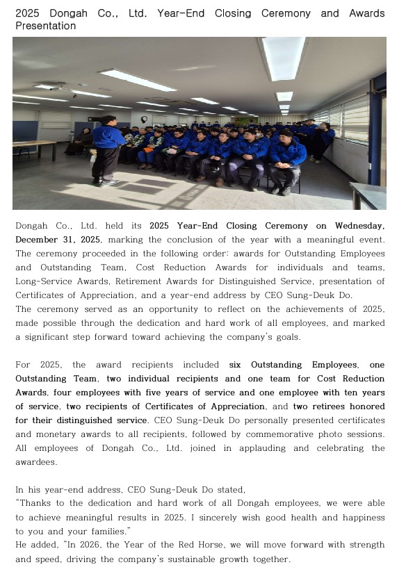 2025 Dongah co. Ltd. Year-End closing Ceremony 페이지 정보 작성자 관리자 댓글 0건 조회 263Views 작성일 26-01-12 11:39 목록 본문 . NextDongah achieves zero-Accident for a year