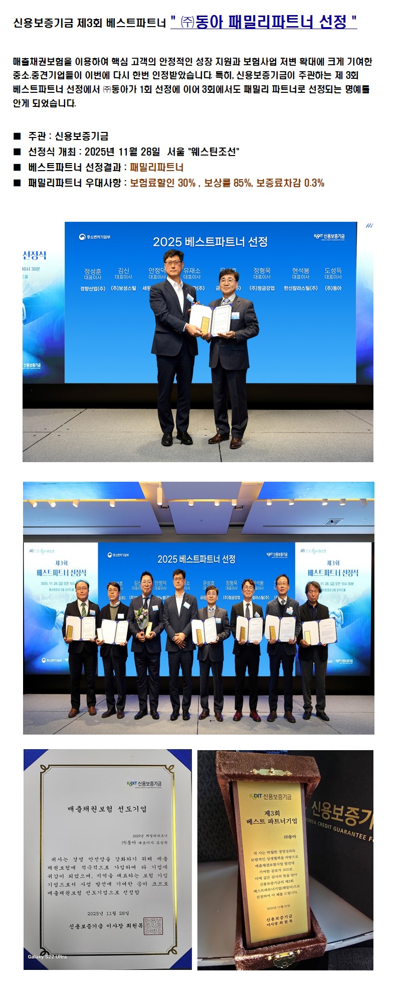 신용보증기금 제3회 베스트파트너 (주)동아 패밀리 파트너 선정 페이지 정보 작성자 관리자 댓글 0건 조회 22회 작성일 25-12-17 11:51 목록 본문 . 다음글(주)동아 무재해 1배수 달성 기념!